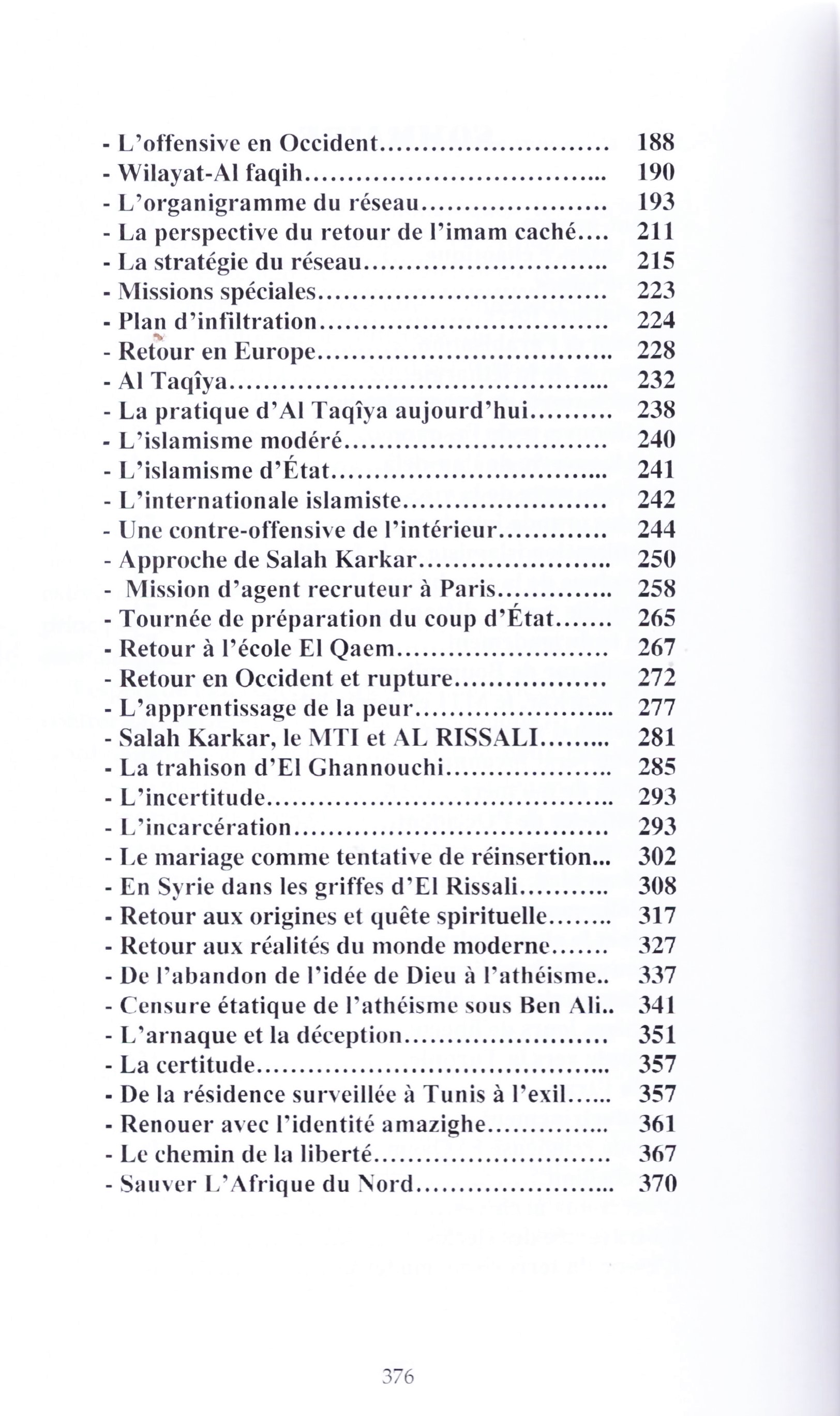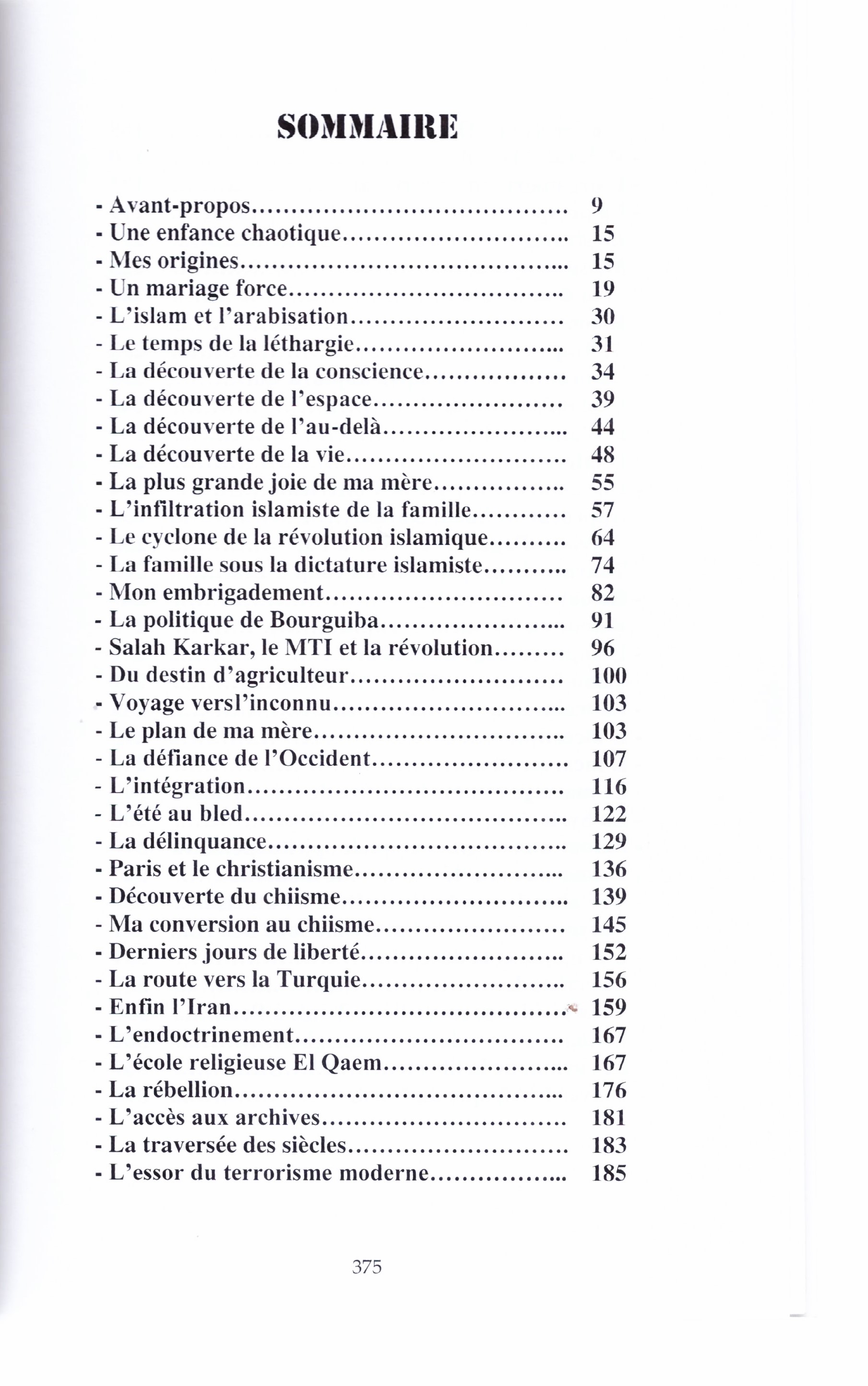 Je suis né à Tunis dans une famille musulmane traditionnelle de neuf enfants, pareille à n’importe quelle autre. J’ai gardé de mon enfance des souvenirs paradisiaques. Mais j’ai perdu très vite la légèreté d’esprit propre à cet âge. Avec le recul, je constate que j’en ai été privé par les cinq années d’enfer qu’a vécues entre 1975 et 1980 ma famille livrée à l’infiltration islamiste . Ce bouleversement qui m’a marqué pour le reste de ma vie préfigure ce qu’a vécu la Tunisie en 2011 . En effet, ce qui arrive au niveau d’un pays arrive aussi au niveau d’une ville, d’une famille, d’un individu. Nous sommes l’histoire, souvent à notre insu. Il me semble important aujourd’hui de témoigner de cette descente aux enfers et de porter au grand jour mon vécu dans la mouvance islamiste. Je décrirai les mécanismes et les méthodes qui ont conduit ma famille à adhérer aux théories islamistes, ses hésitations, ses déchirements, son éclatement, puis mon histoire personnelle dans les rets d’un mouvement chiite international à l’idéologie messianique qui continue aujourd’hui d’œuvrer en toute impunité après avoir transféré ses bases de l’Iran vers la Syrie et l’Irak