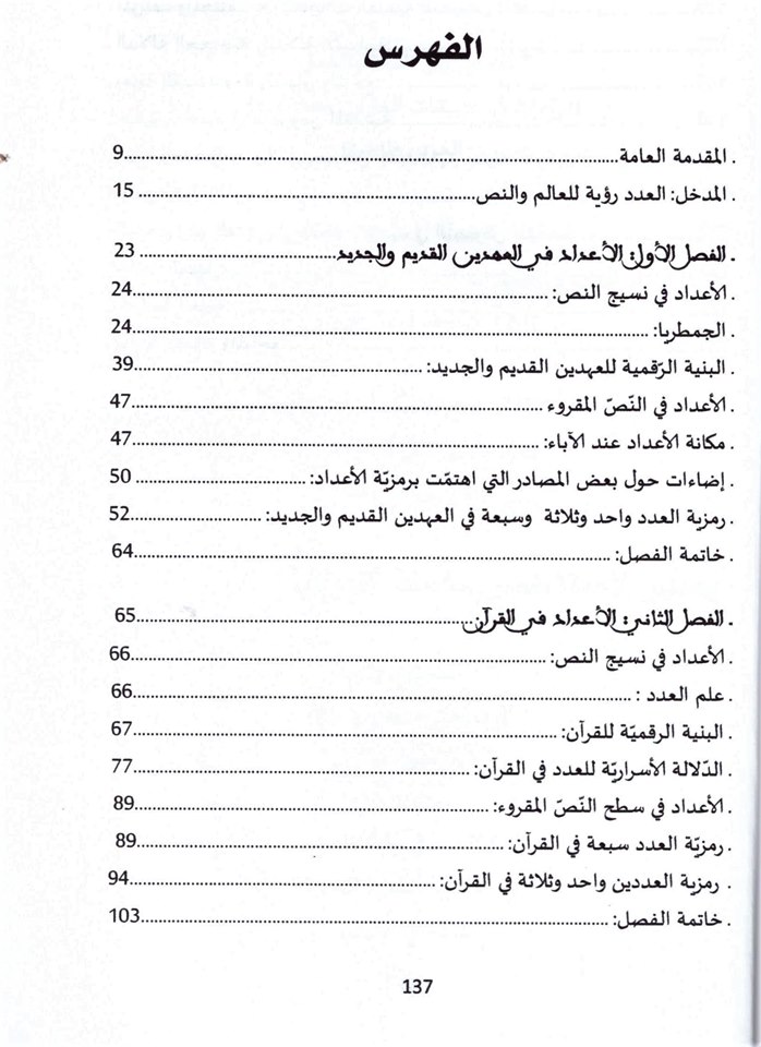 هو بحث يقوم في جوهره على الكشف عن طرائق حضور الأعداد في النصوص المقدسة وبالتحديد في العهدين القديم والجديد والقرآن. وينهض بمهمة النظر في المنطق الذي ينظم الدلالات المختلفة للاعداد، وذلك انطلاقا من التأملات والقراءات العددية التي عدّت الأعداد في هذه النصوص ذات دلالة أسرارية باطنية أو رمزية، ينشغل بتعليل هذه الدلالات وبتتبع نقاط الائتلاف والاختلاف بين القراءات التي أقامت تصورها للأعداد عليها.