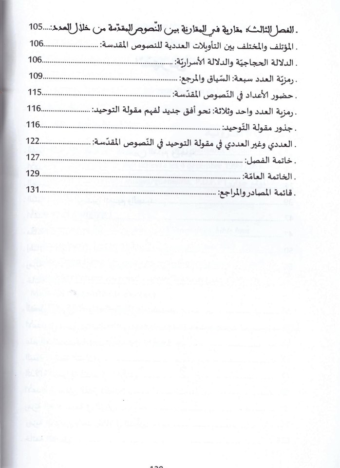 هو بحث يقوم في جوهره على الكشف عن طرائق حضور الأعداد في النصوص المقدسة وبالتحديد في العهدين القديم والجديد والقرآن. وينهض بمهمة النظر في المنطق الذي ينظم الدلالات المختلفة للاعداد، وذلك انطلاقا من التأملات والقراءات العددية التي عدّت الأعداد في هذه النصوص ذات دلالة أسرارية باطنية أو رمزية، ينشغل بتعليل هذه الدلالات وبتتبع نقاط الائتلاف والاختلاف بين القراءات التي أقامت تصورها للأعداد عليها.