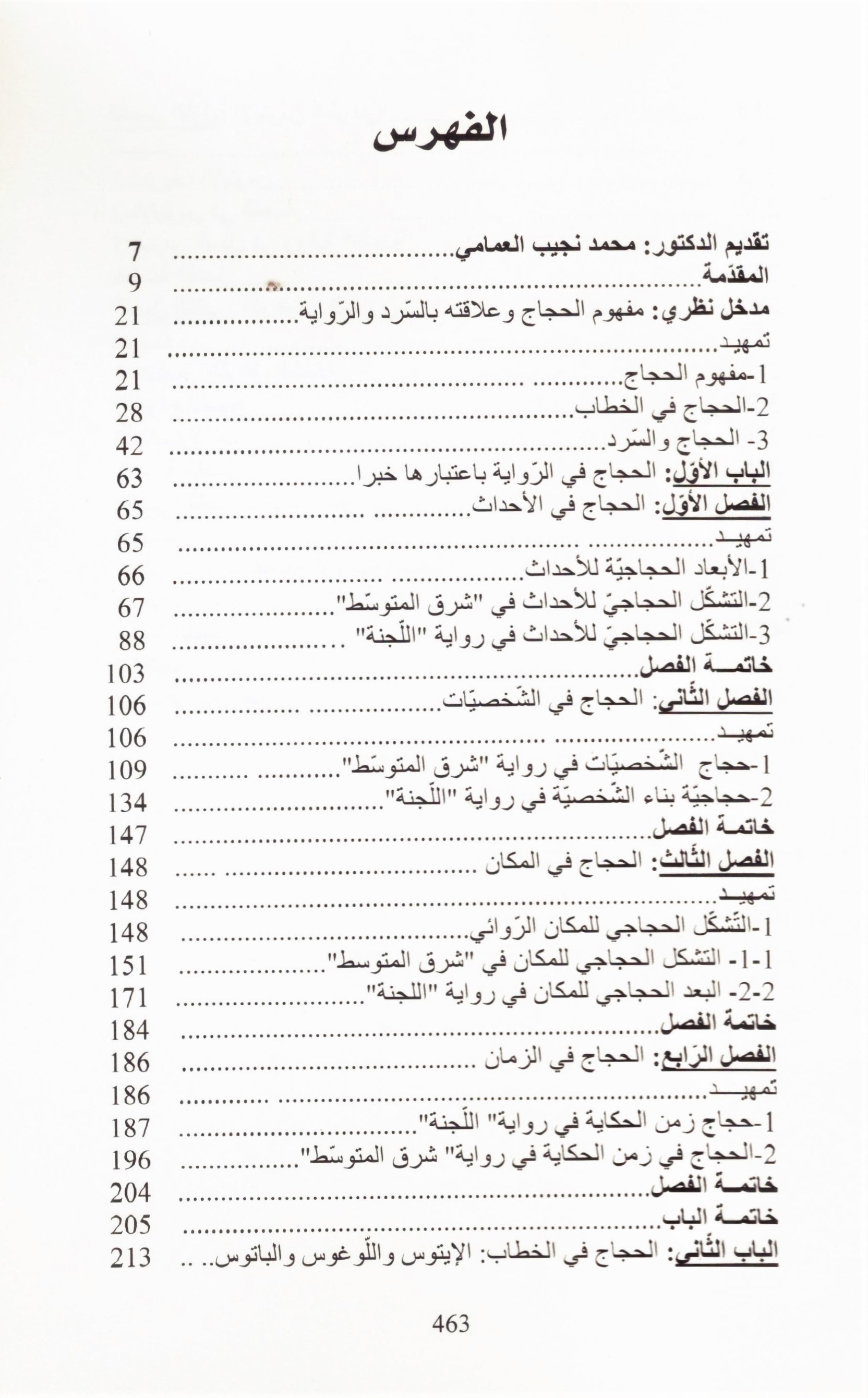فدراسة الحوار الروائي أوقفت الباحث على ما يتضمنه من حجاج صريح ومباشر، ولعل ذلك ما دعاه الى تتبع الظاهرة في مدونة أوسع، والى توسيع مجال البحث ليشمل الحوار وكافة مكونات السرد الروائي وفق الثنائية التقليدية: الخبر أو الحكاية والخطاب. وما كان للباحث أن ينجز عملا بهذا الحجم لو لم يعتمد تصورا واسعا للحجاج يراه ملازما للخطاب، ويراه ضربين، مقصدا حجاجيا أو حجاجا صريحا ومباشرا، وبعدا حجاجيا أو حجاجا خفيا وغير مباشر.