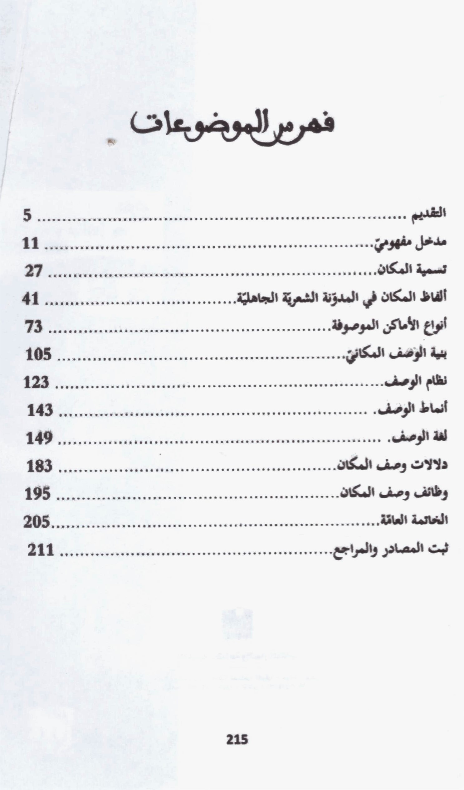 عند نقطة الالتقاء بين المبحثين. الوصف والمكان. يقع هذا العمل. فيما نرى. موقع التفرد، ذلك أنه يجمع بين مبحثين كلاهما مطروق ولكن اجتماعهما متروك. ان عملنا هو بحث في وصف المكان باعتباره صنفا وصفيا له مقوماته الفنية والمضمونية والدلالية اخترنا له مدونة شعرية لها خصوصياتها هي الشعر الجاهلي.